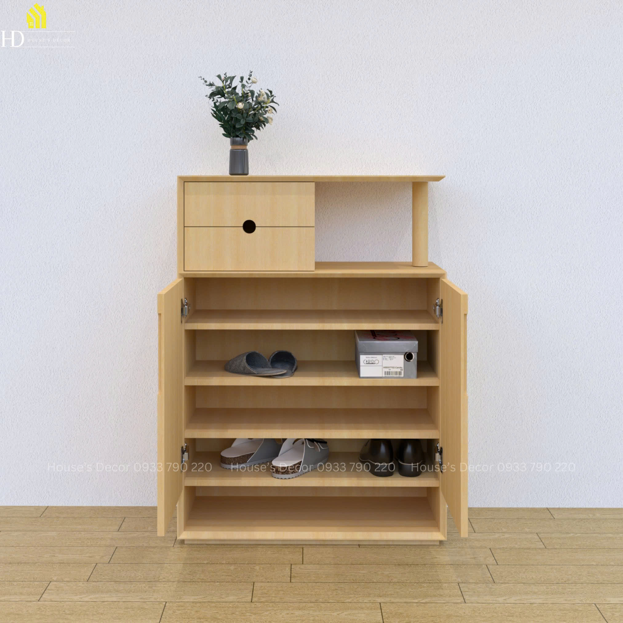 Tủ được chia ra 3 không gian sử dụng. Không gian chính với 2 cánh cửa mở được chia thành 5 tầng, mỗi tầng chúng ta có thể điều chỉnh kích thước của tấm đợt để phù hợp với nhu cầu sử dụng. Bên trên không gian chính là 2 ngăn kéo chúng ta có thể dùng nó để bảo quản những đồ vật dễ thất lạc như là chìa khoá, khẩu trang, giấy tờ,...