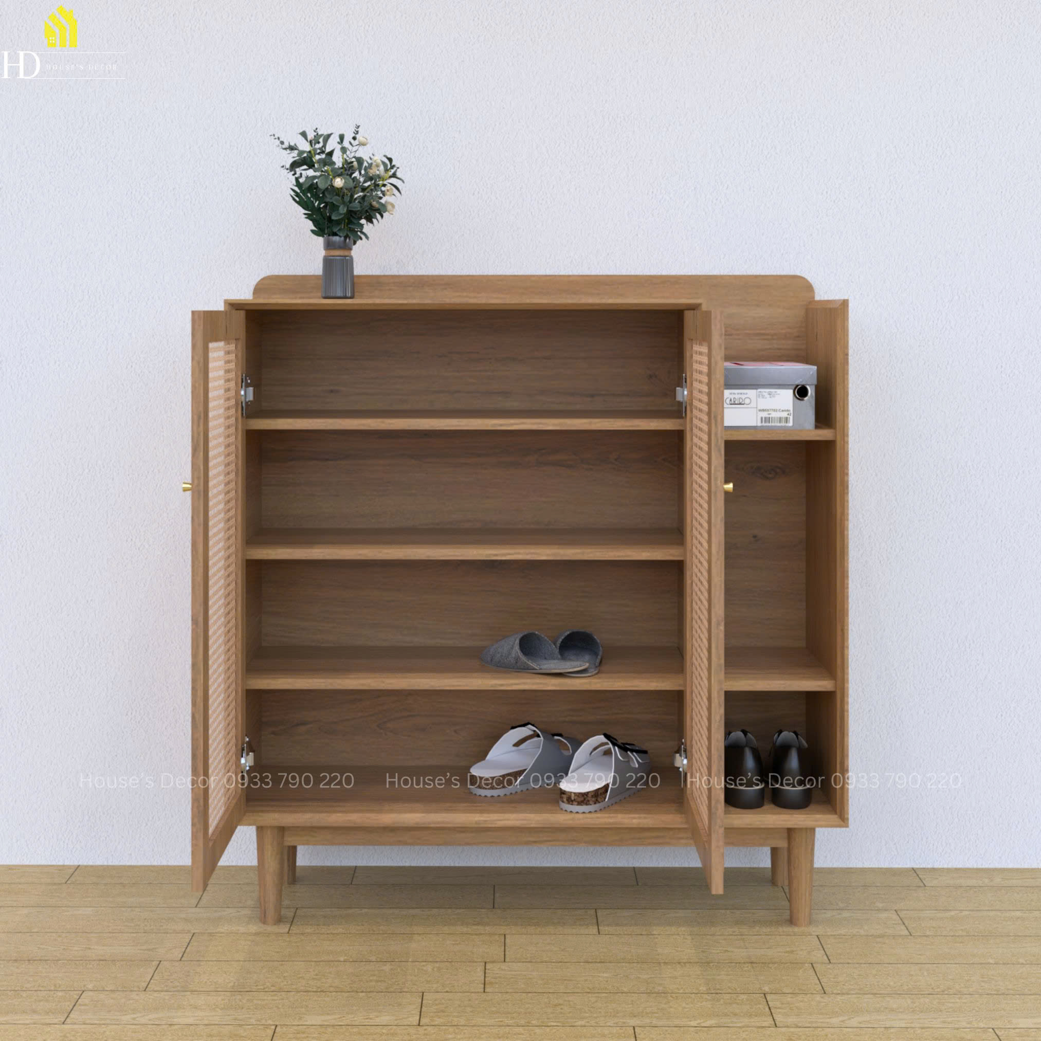 Thiết kế với những đường nét bo cong mềm mại nhưng vẫn giữ được nét sang trọng. Tủ giày được làm hoàn toàn từ chất liệu gỗ tự nhiên nên an toàn trong quá trình sử dụng cũng như khả năng chống ẩm, mối mọt đã được xử lý hoàn toàn. Tủ được chia làm 3 không gian lưu trữ. Không gian lưu trữ chính được kết hợp với cửa mở 2 cánh mây giúp không khí lưu thông để tủ giày không bị bí mùi. Ngăn bên cạnh với kích thước cao hơn có thể để những đôi boots, dù,... Trên cùng là không gian trang trí để tủ có thêm điểm nhấn.