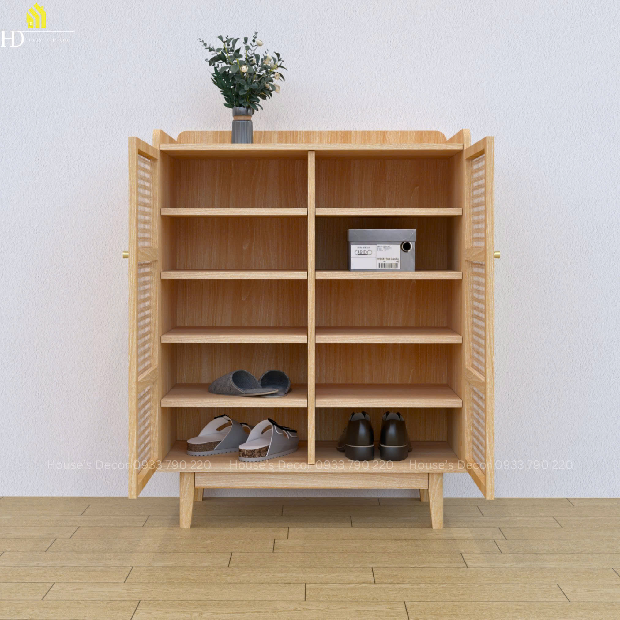 Được sản xuất từ 100% thành phần gỗ tự nhiên nên chắc chắn đem lại sự an toàn khi sử dụng sản phẩm. Tủ được thiết kế với kiểu dáng thanh lịch, hiện đại với những đường nét bo cong mềm mại đã tạo ra được "điểm nhấn" cho sản phẩm lần này. Với thiết kế 2 cánh mây, tủ được chia thành 5 ngăn với sức chứa lên đến 20 - 25 đôi giày phù hợp cho hộ gia đình từ 2 - 4 người. Ngoài ra, trên mặt tủ chúng ta có thể tận dụng khoảng trống đó để trang trí nhà, để nón bảo hiểm hay hộp khẩu trang,....