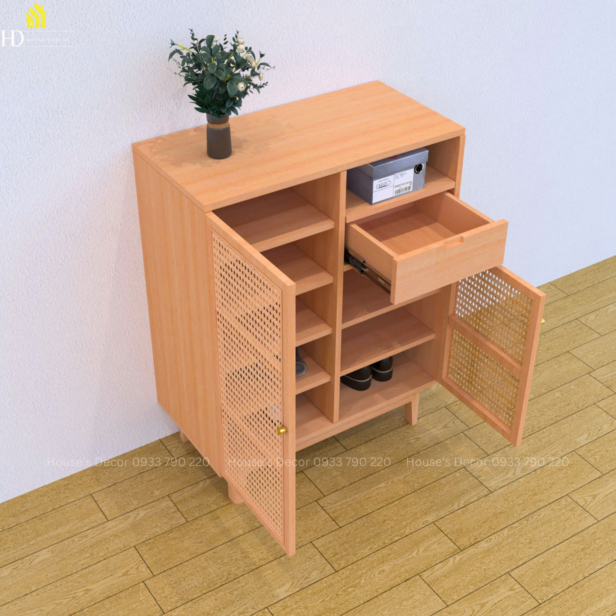 Tủ giày 2 cánh mây Zalot với sức chứa lên đến 20 - 25 đôi giày phù hợp cho gia đình 4 người. Không những để giày dép, trên mặt tủ bạn cũng có thể một số đồ trang trí hay hộp khẩu trang, chìa khoá, nón bảo hiểm,... Tủ giày chân cao cũng là một ưu điểm khi bạn có thể dễ dàng vệ sinh sàn nhà mà không lo bị trầy xước. trong không gian sống của mình.